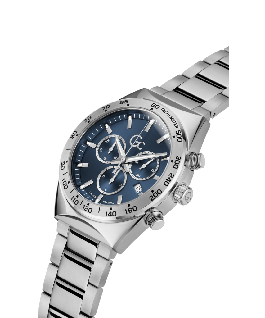 Un style sophistiqué de jour comme de nuit avec la Gc Clubhouse et son boîtier de 42 mm qui s'adapte à tous les poignets d'hommes pour toutes les occasions, ici dans un ton entièrement argenté avec un cadran bleu pétrole.