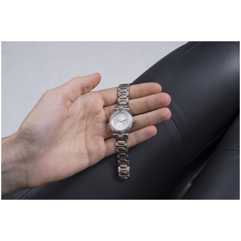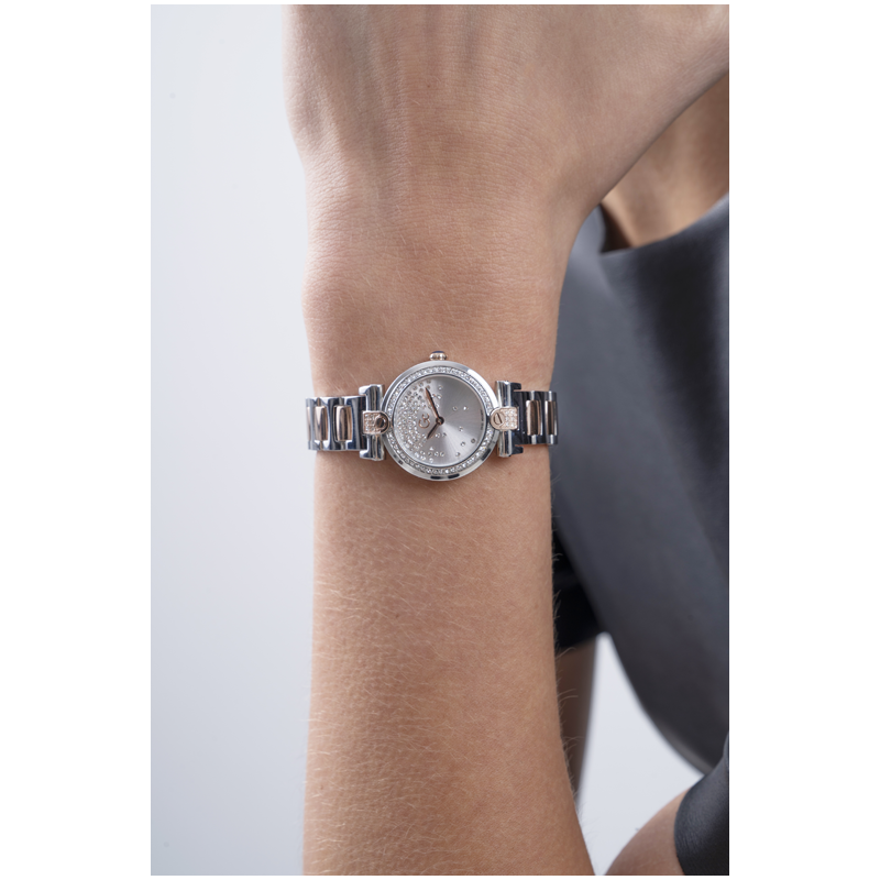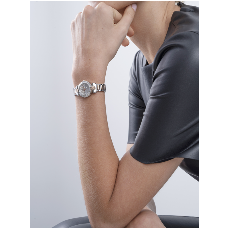 Craquez pour la beauté de la Gc FUSION, une montre au boîtier fin de seulement 26mm. Représente l'emblème des montres Gc avec sa fixation Iconic T-bar. La lunette est entourée d'un anneau de cristaux, tandis que le cadran argenté est décoré d'une pluie de pierres assortie à la fixation du bracelet.