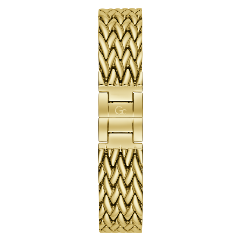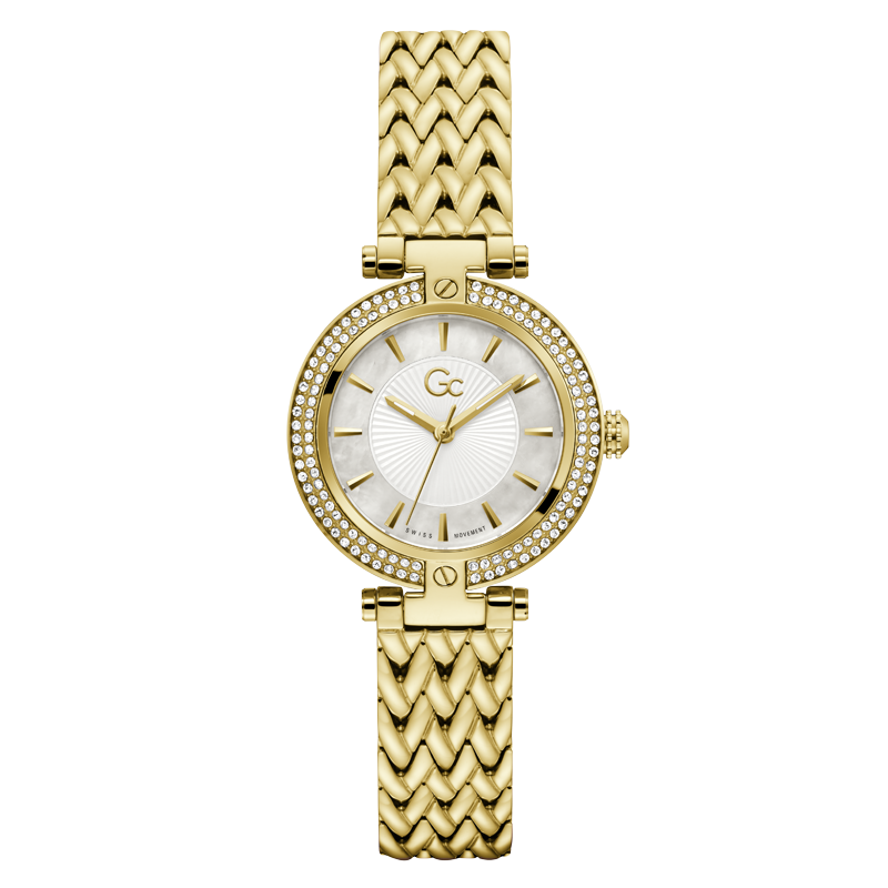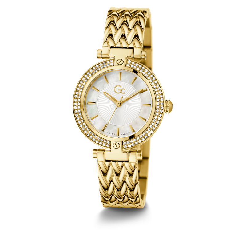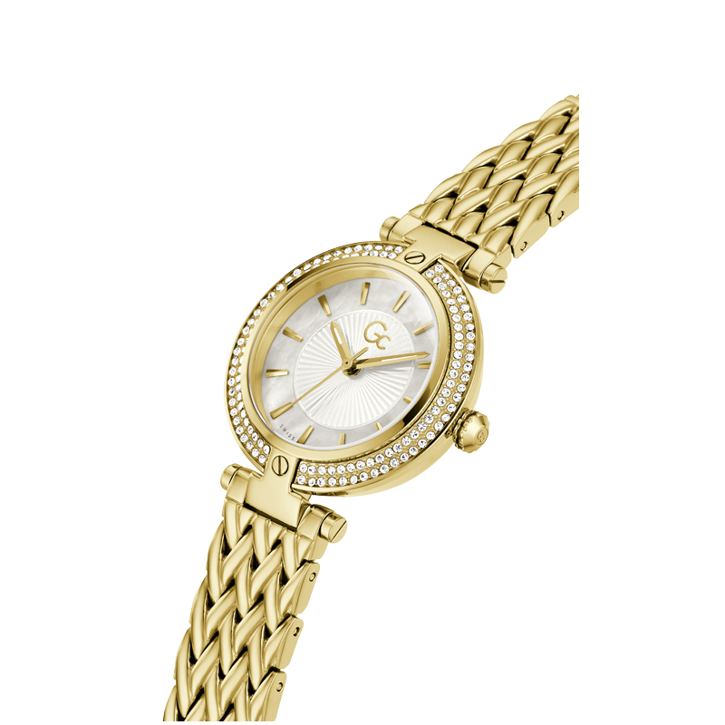 À la fois rafraîchissante et raffinée, la Gc Vogue présente un boîtier de 32 mm orné de deux rangées de cristaux européens, associé à un bracelet sophistiqué, le tout en PVD couleur gold . Son cadran en nacre blanche complète élégamment l'ensemble.