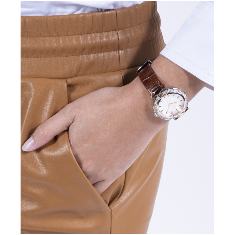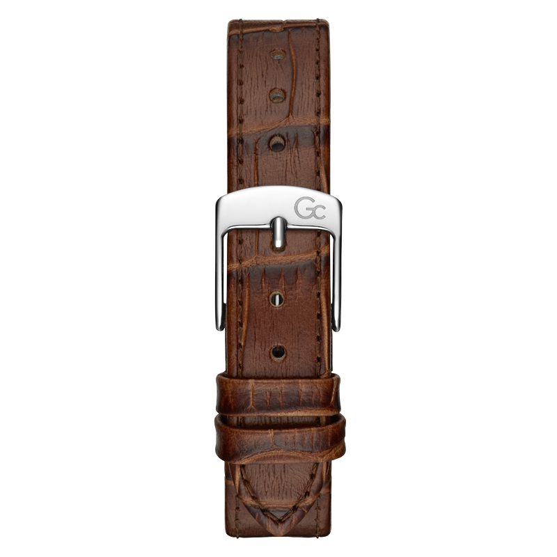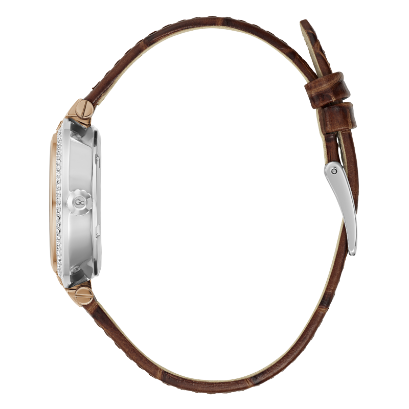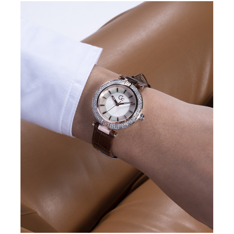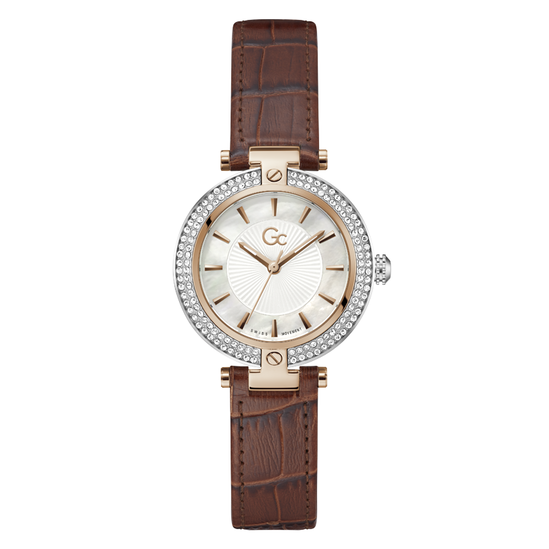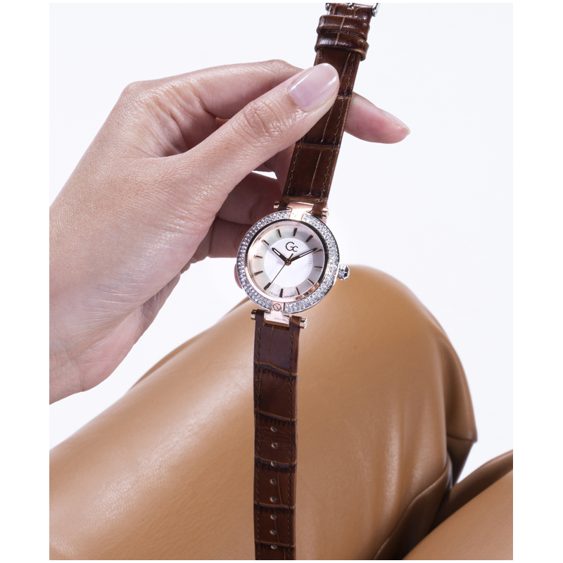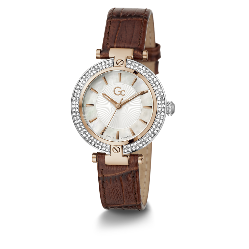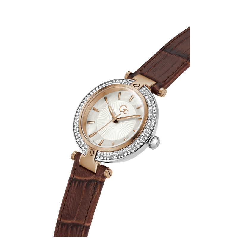 À la fois rafraîchissante et raffinée, la Gc Vogue présente un boîtier de 32 mm orné de deux rangées de cristaux européens, associé à un bracelet en cuir croco marron eco-friendly . Son cadran en nacre blanche complète l'ensemble.