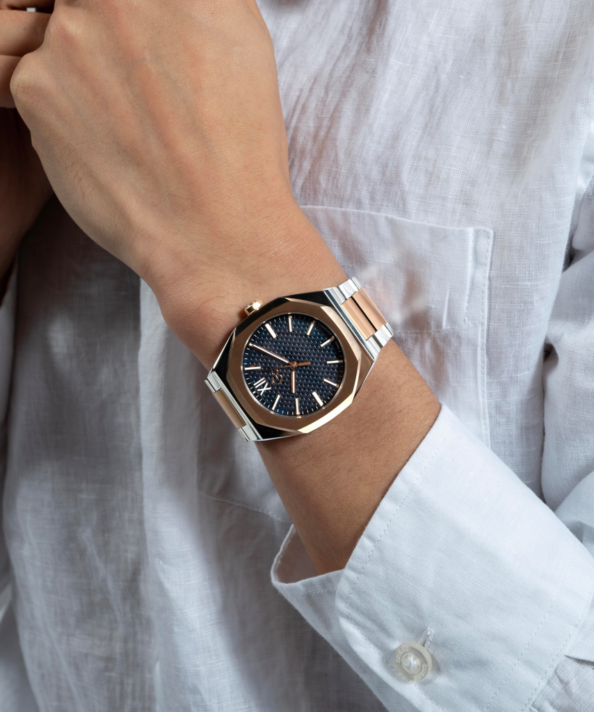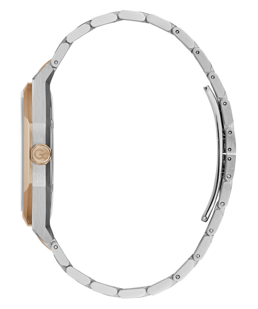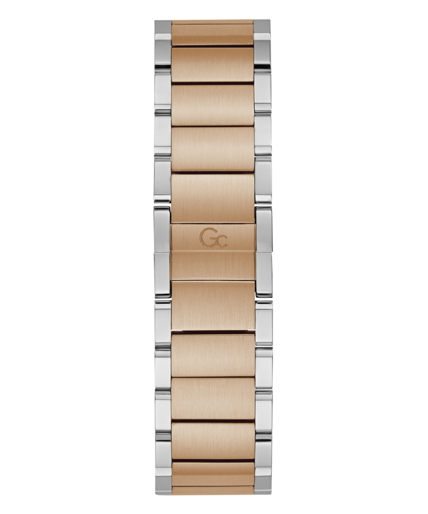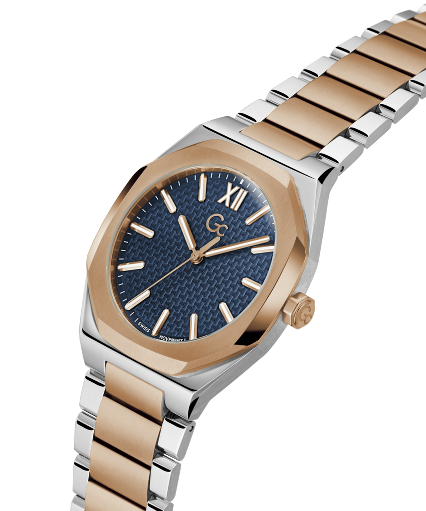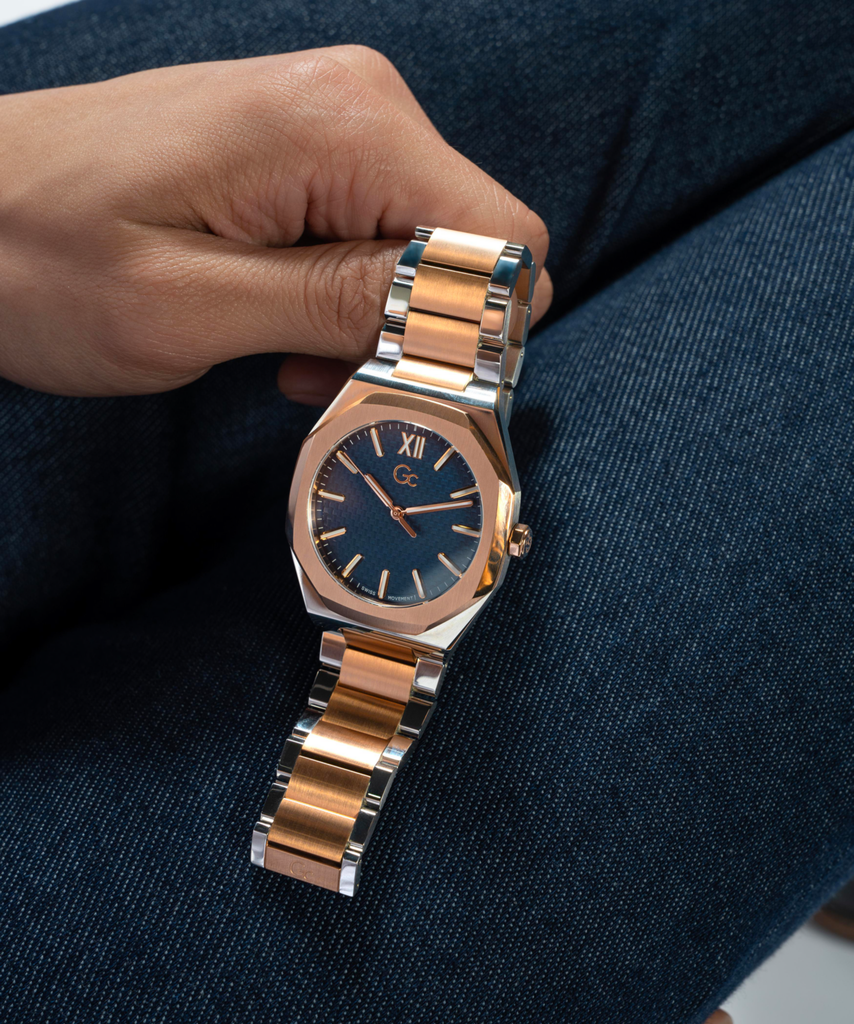 La Gc Coussin Sleek revisite notre look emblématique en forme de coussin avec une touche plus élégante. Son boîtier mince de 42 mm, sa bague supérieure raffinée, et son cadran tissé aux détails incroyables en deux tons argent et PVD or rose, avec un élégant cadran bleu, en font une montre particulièrement chic.