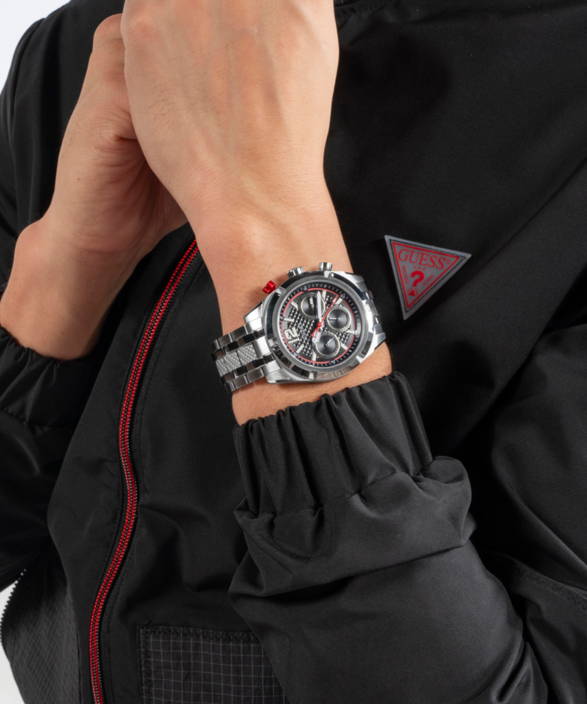 Ce nouveau style sportif GUESS  est difficile à résister avec son cadran texturé multifonction à look chronographe et son bracelet texturé innovant.