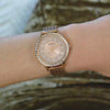 Cette montre élégante est ornée de cristaux en baguette tout autour de son boîtier et d'un cadran étincelant avec un motif de rayons de soleil. Son bracelet en maille milanaise à motif chevron en acier inoxydable ajoute une touche de sophistication supplémentaire.