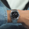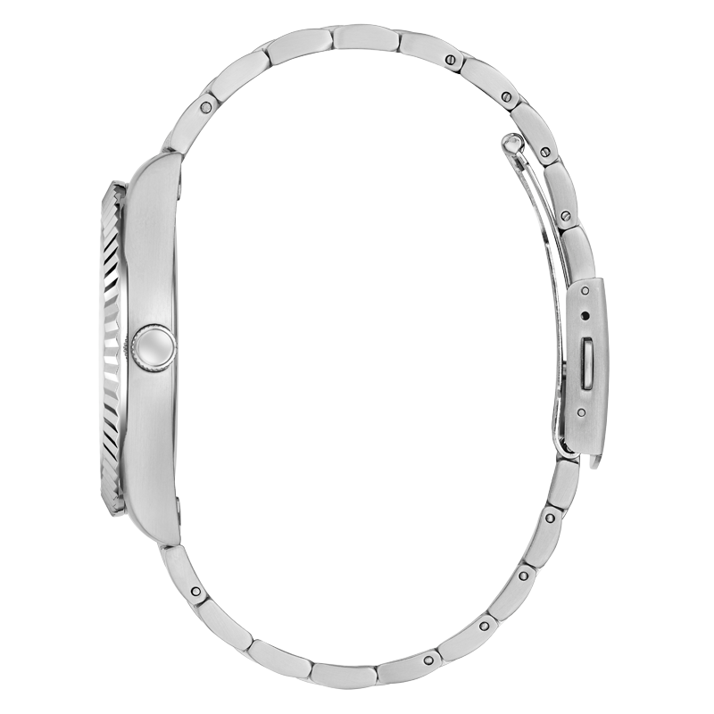 Cette montre arbore un look classique qui ne se démode jamais. La lunette avec bordure cannelée est intégrée à un bracelet à trois maillons brossés et polis, et dispose d'une fenêtre jour de la semaine à midi avec une date à bulle à 3 heures.