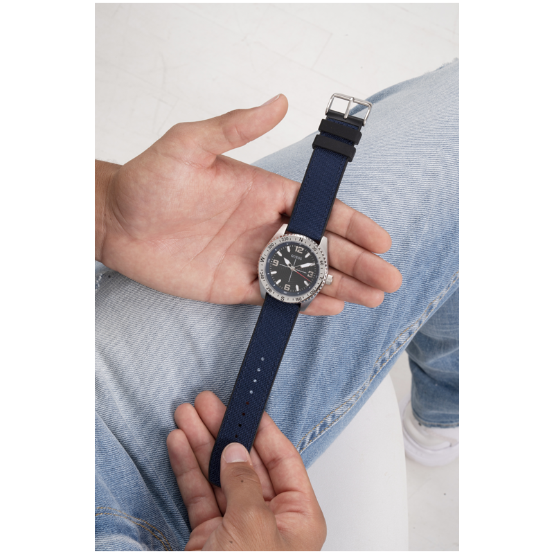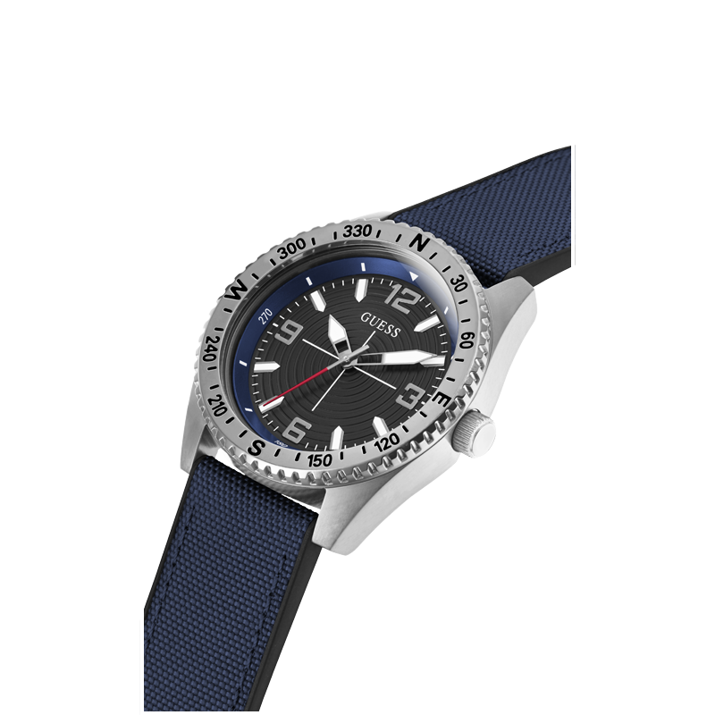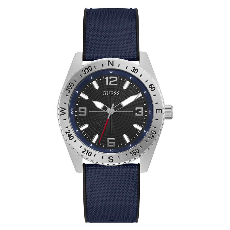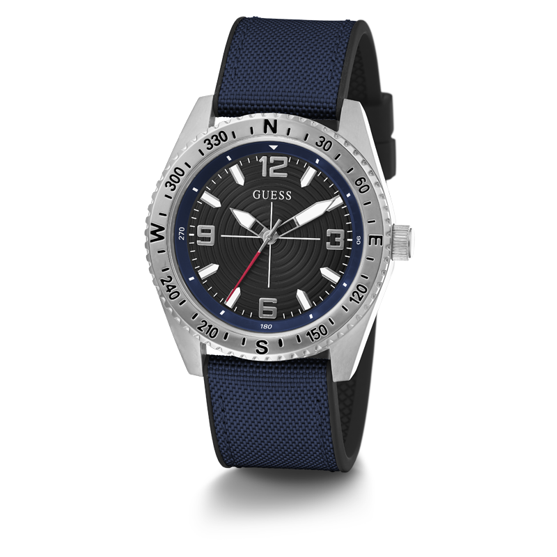 Découvrez votre véritable direction avec ce design de montre semblable à une boussole, qui est ornée d'un fond noir et joliment assortie à un bracelet FLEX emblématique, doté d'une couche supérieure en nylon et d'un dos en silicone.
