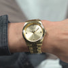Cette montre arbore un look classique qui ne se démode jamais. La lunette avec bordure cannelée est intégrée à un bracelet à trois maillons brossés et polis, et dispose d'une fenêtre jour de la semaine à midi avec une date à bulle à 3 heures.