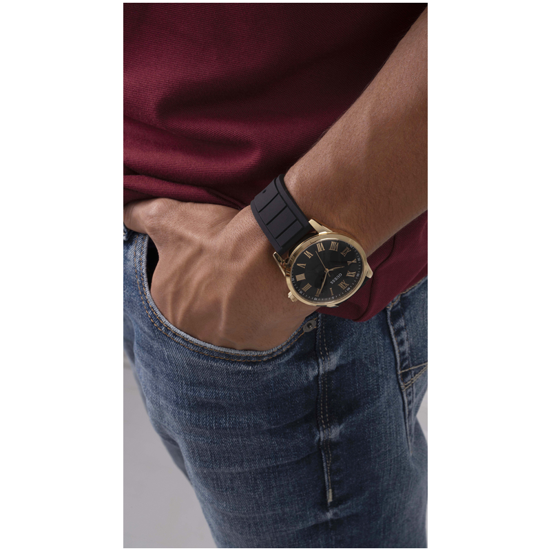 Un cadeau idéal à offrir ou pour se faire plaisir et compléter sa garde-robe. Ce modèle élégant présente un boîtier gold et un cadran noir sur un bracelet en silicone.