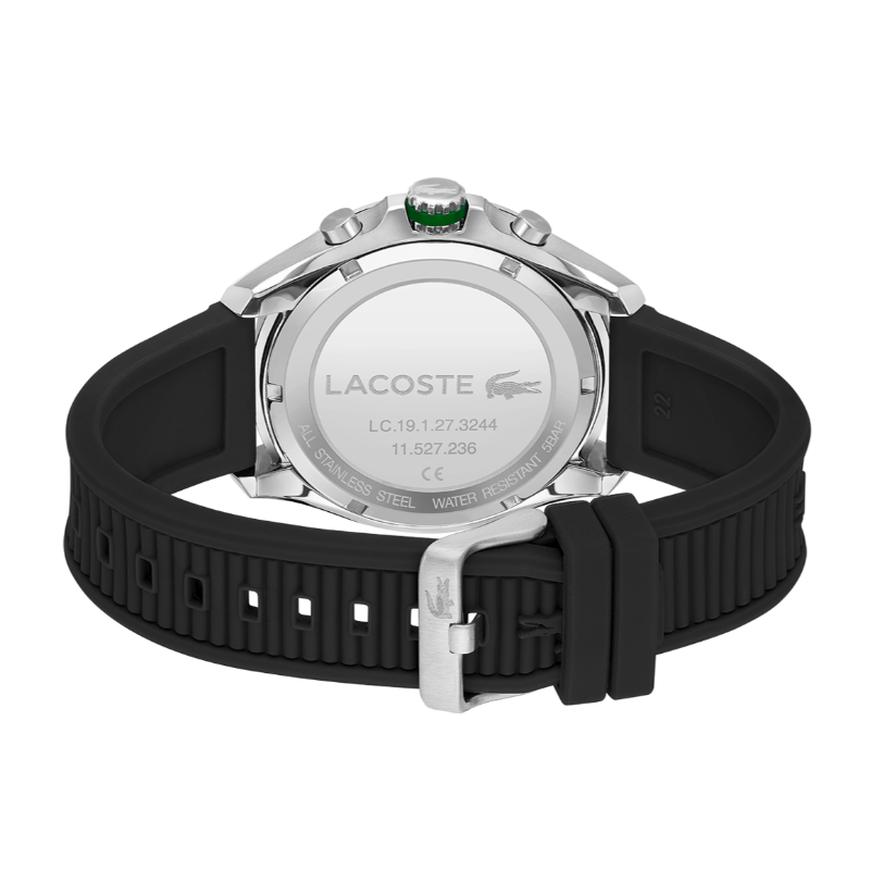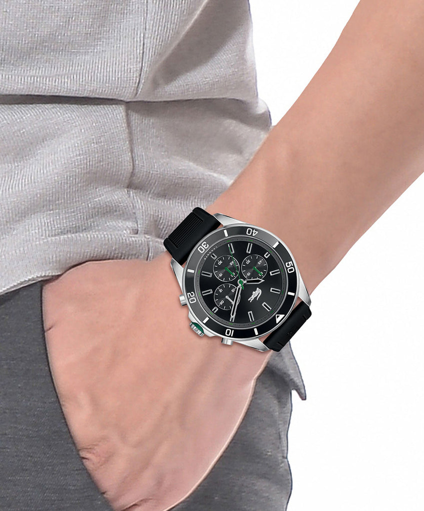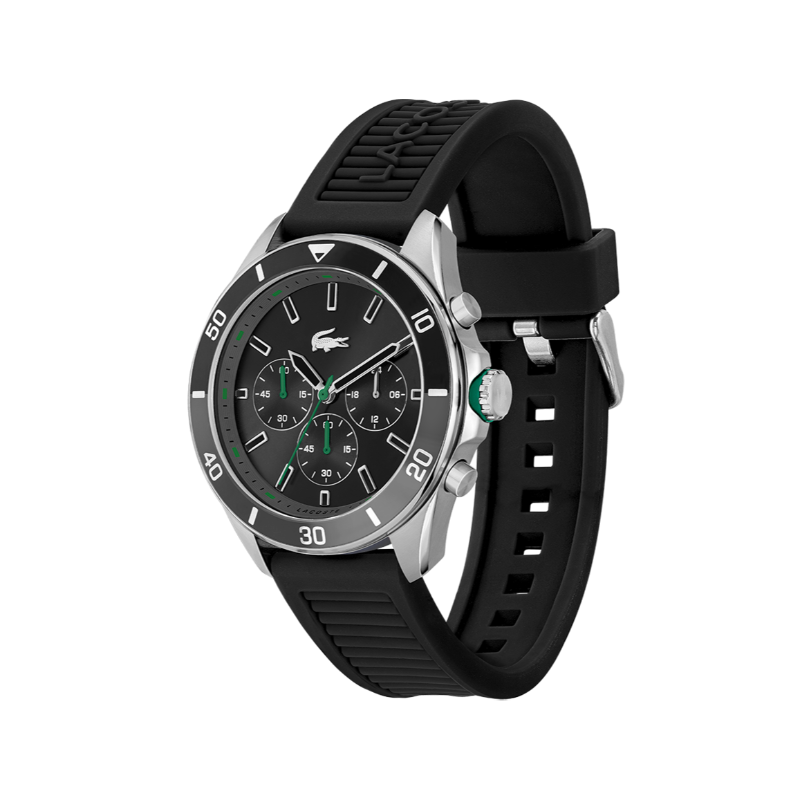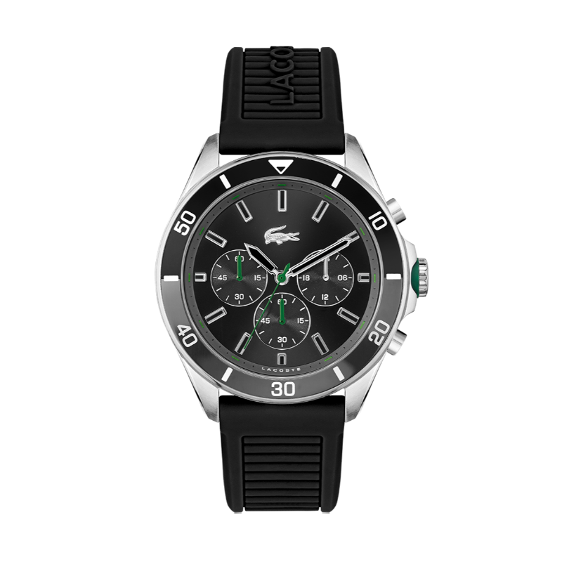La Tiebreaker est une montre à trois aiguilles avec fonction date qui attire l'attention grâce à son esthétique sportive et accrocheuse, comprenant une lunette en aluminium bicolore. Le cadran mat avec finition rayons de soleil est orné d'une bague réfléchissante, d'index surélevés et d'un crocodile emblématique à 3 heures. Un bracelet intégré en maillons H ou un bracelet en silicone texturé complète le design.