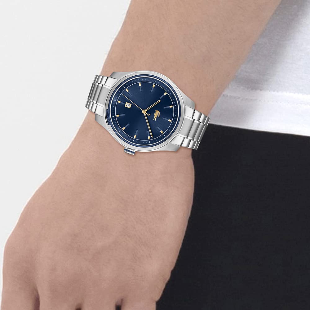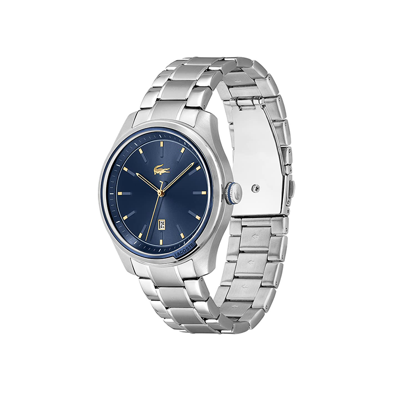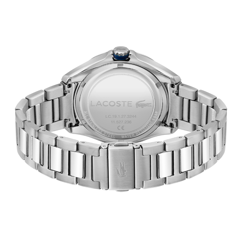La montre raffinée Musketeer s'inspire de l'héritage de la marque. Cette montre à trois aiguilles avec fonction date présente un élégant insert de marque sur la lunette, tandis que son bracelet à cinq rangs rappelle les liserés du classique polo Lacoste. L'utilisation sophistiquée des couleurs et le crocodile emblématique sur le cadran complètent ce design élégant et raffiné.