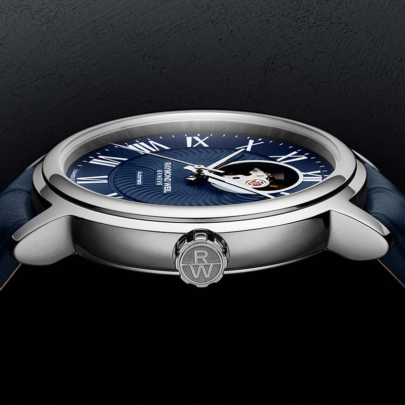 La collection Maestro Blues de Raymond Weil est une gamme de montres pour homme inspirée des sonorités envoûtantes du "Blues". Equipée d'un mouvement mécanique à remontage automatique, chaque garde-temps est logé dans un boîtier en acier inoxydable de 40 mm de diamètre, avec une ouverture subtile à midi qui dévoile délicatement le cœur de la montre. Le captivant cadran bleu foncé, orné d'un délicat décor ondulant, ajoute une touche de sophistication à l'ensemble.