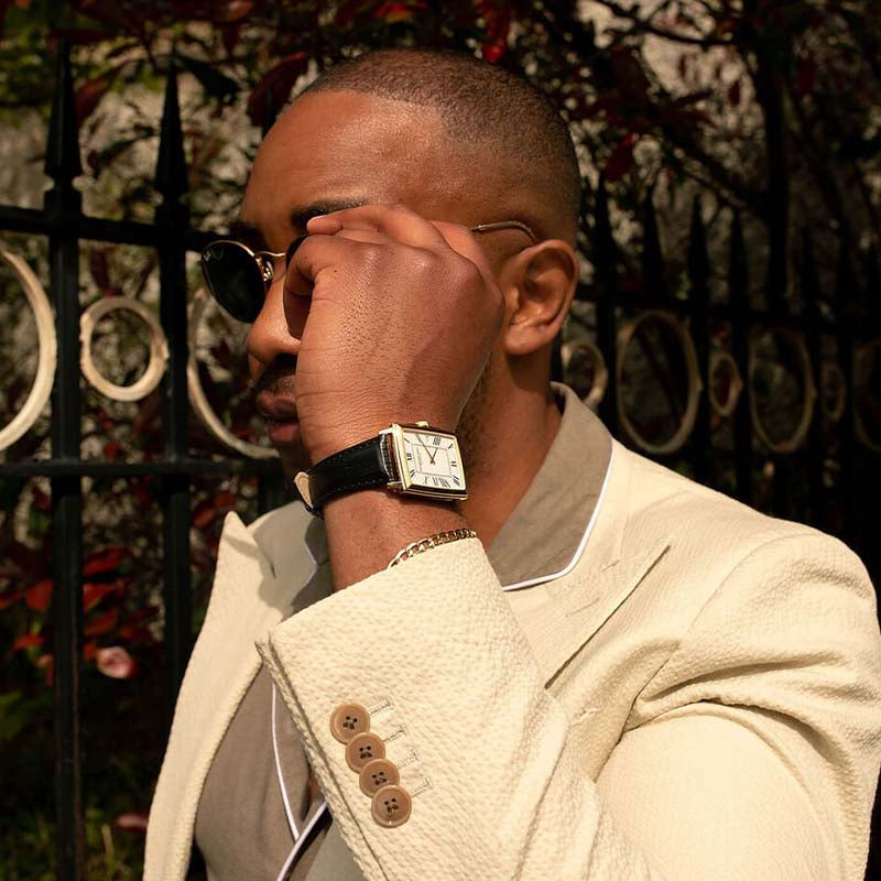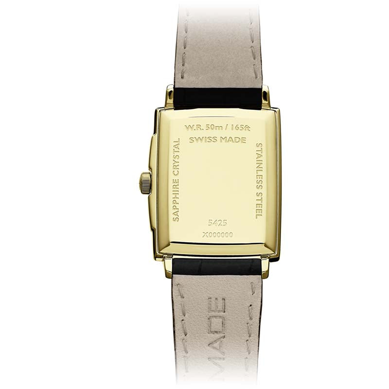 Cette montre Toccata Classique pour homme, plaquée or et équipée d'un mouvement à quartz, possède un boîtier rectangulaire en acier inoxydable élégant avec une fenêtre de date à 3 heures. Son cadran blanc sophistiqué est ponctué de marqueurs en chiffres romains noirs et son bracelet en cuir de veau noir véritable ajoute une touche chaleureuse à ce classique moderne.