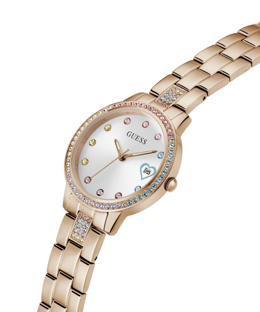 Un arc-en-ciel de cristaux entoure le boîtier délicat de cette montre GUESS, avec des indices assortis et un mouvement de date orné d'un design en forme de cœur fantaisiste.