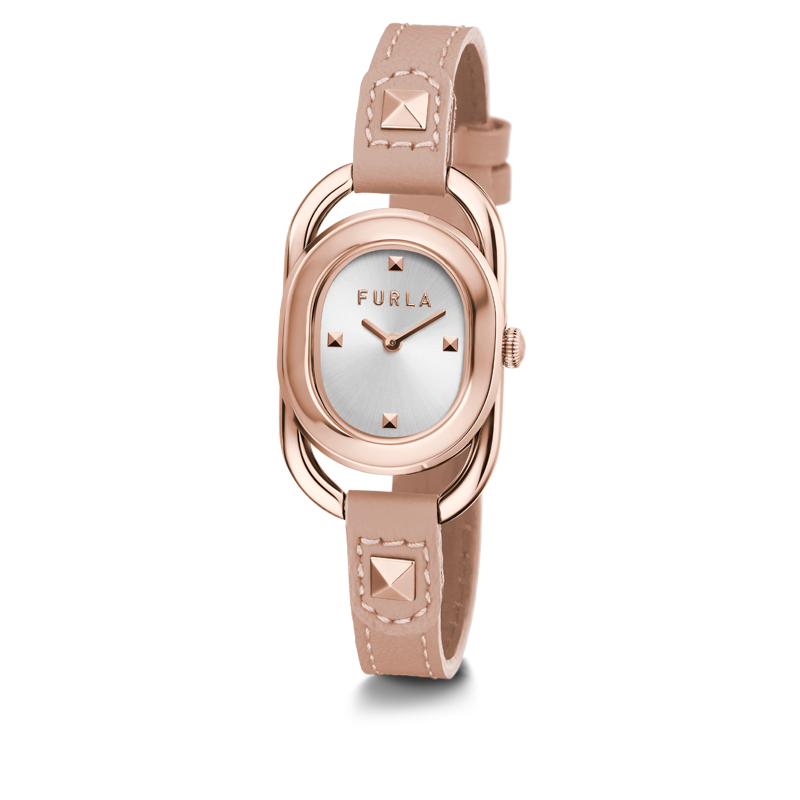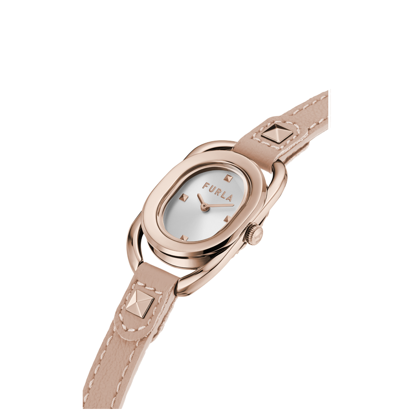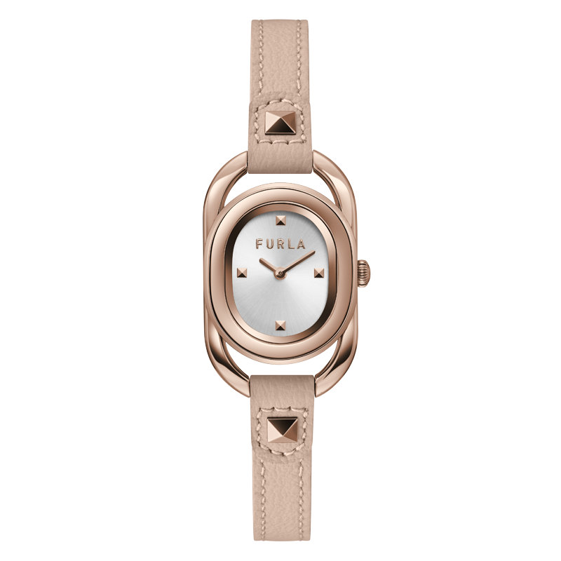 Découvrez la montre FURLA STUDS INDEX (Référence WW00008003L3), une création italienne qui marie harmonieusement l'élégance au raffinement. Son boîtier en acier inoxydable rose gold poli de forme ovale, mesurant 24 mm, abrite un cadran argenté étincelant. Le bracelet en cuir véritable 'Nude' ajoute une touche de sophistication à ce modèle féminin.