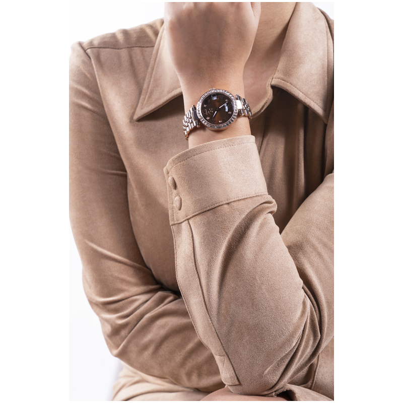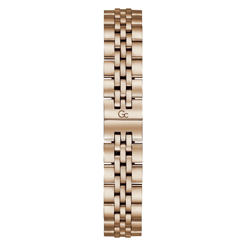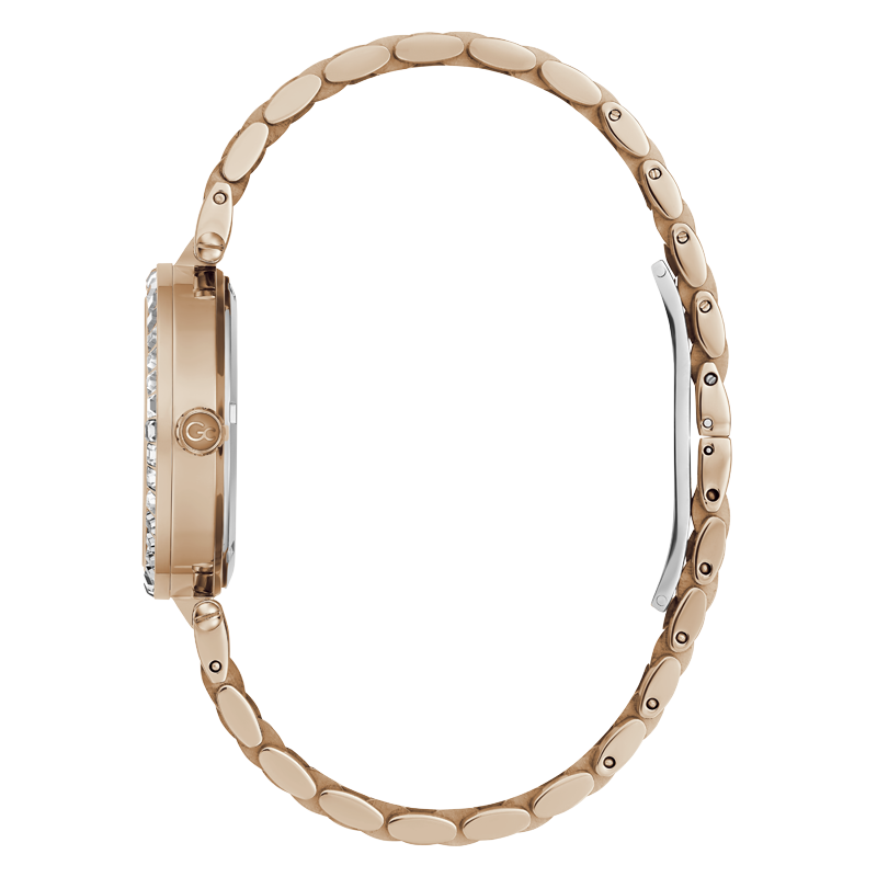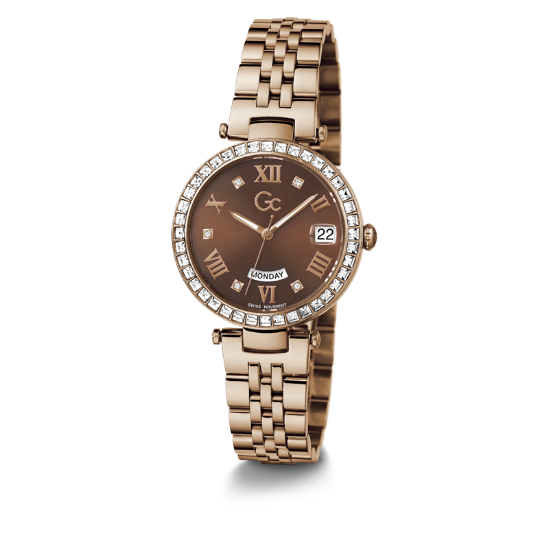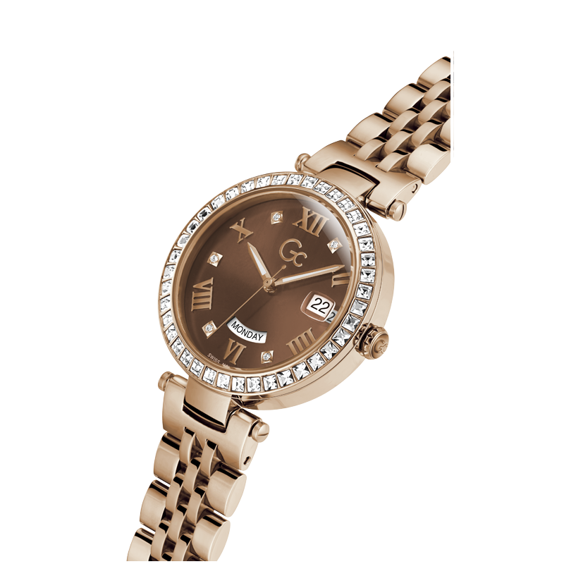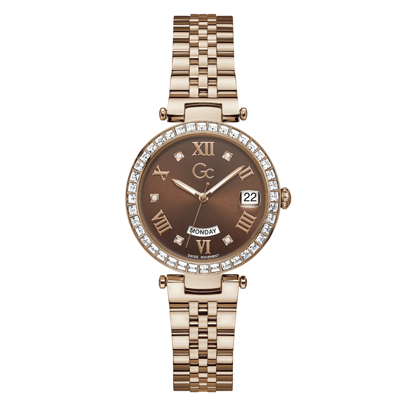 Le Gc Flair ajoute une touche de raffinement à votre tenue quotidienne. Avec sa lunette crantée distinctive et son bracelet confortable à cinq maillons, cette version en or rose est ornée d'un anneau supérieur en cristaux étincelants. Le cadran marron affiche des chiffres romains en or rose, et le mouvement suisse de la date du jour est visible à travers les fenêtres à 3 et 6 heures.