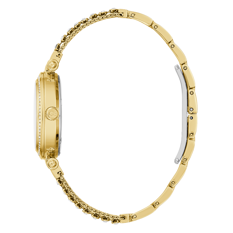 Augmentez l'éclat avec cette montre pour femme au style bijoux tout en tonalités d'or jaune. La lunette entière en cristaux de Swarovski est ornée d'un cadran en nacre blanche et des index Swarovski, accompagné d'un bracelet en maille dorée scintillante, serti de cristaux de Swarovski®.