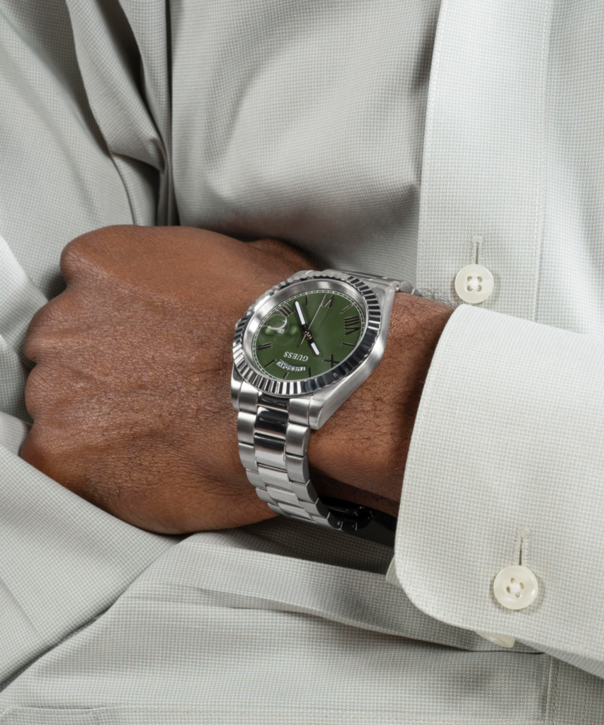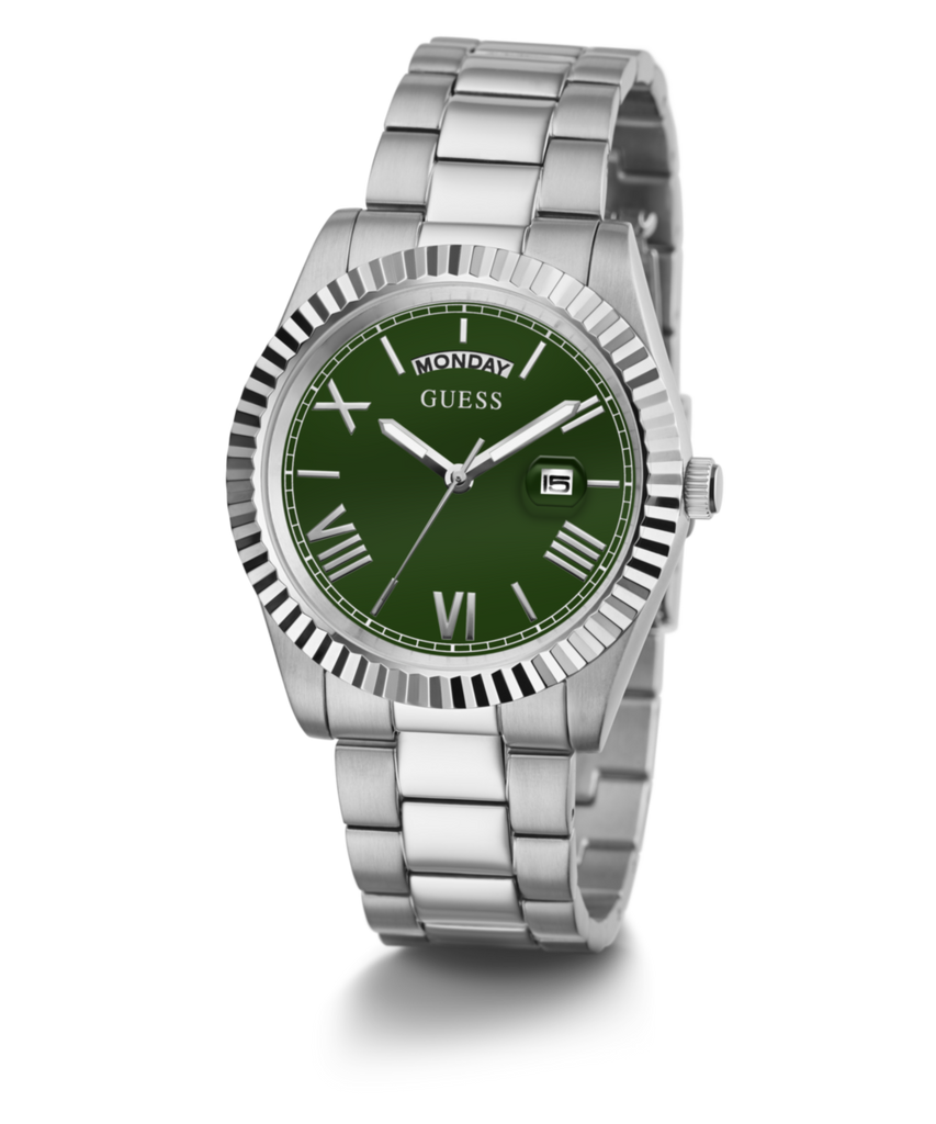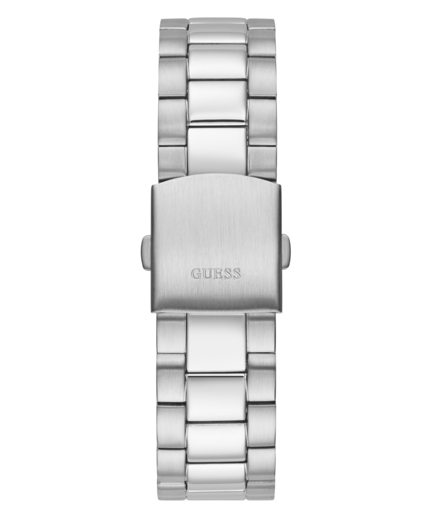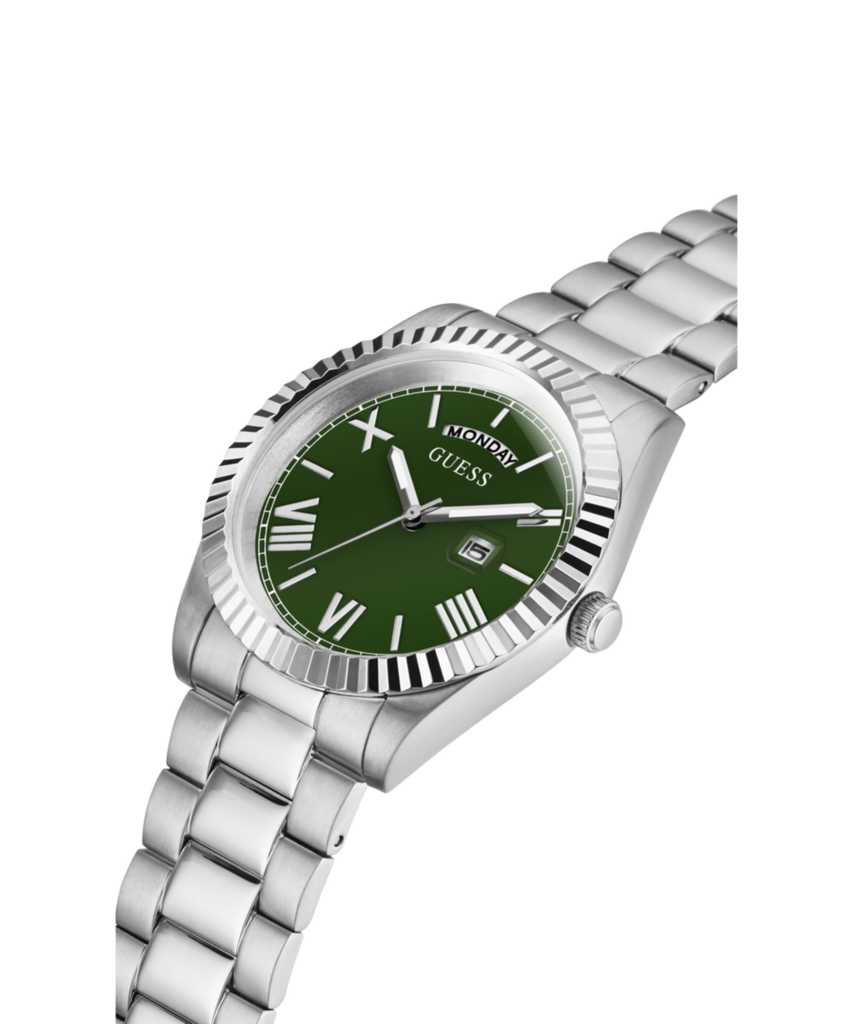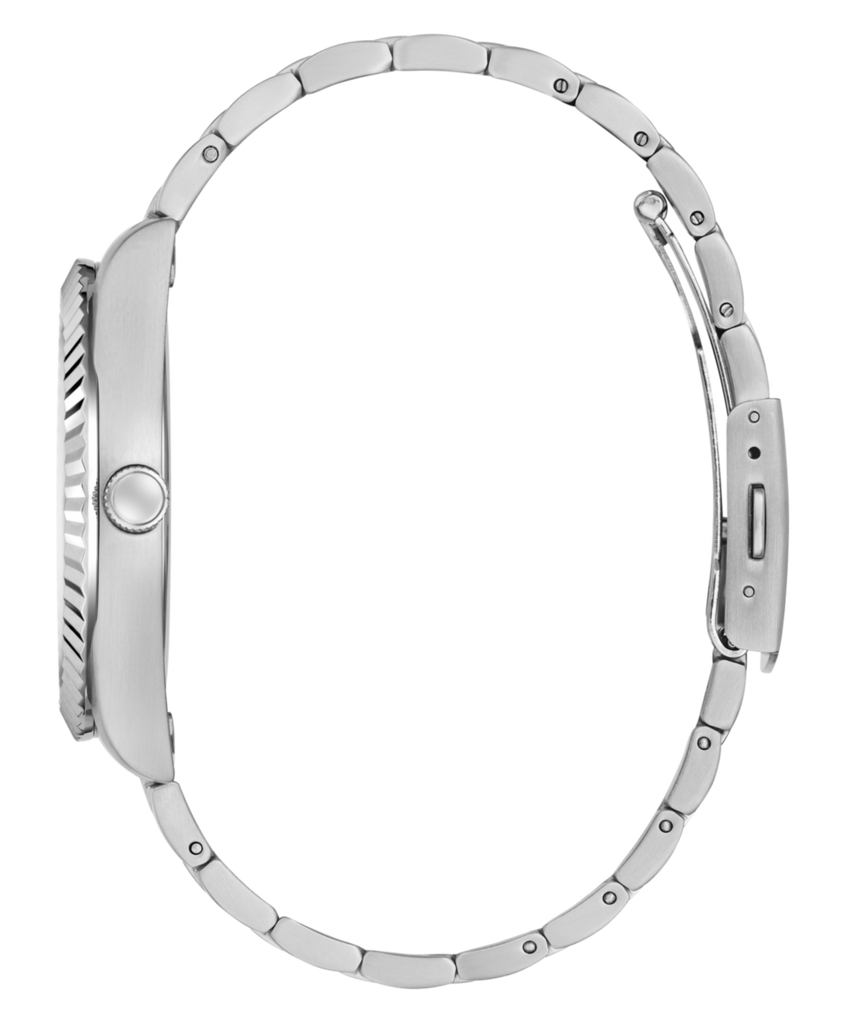 Un look classique GUESS qui ne vieillit jamais. Cette lunette à bord de pièce est intégrée à un bracelet à 3 maillons brossé et poli et présente une fenêtre pour le jour de la semaine à 12 heures avec une date à bulle à 3 heures.