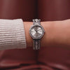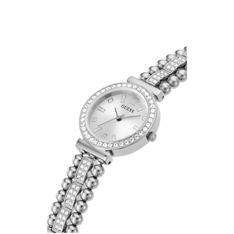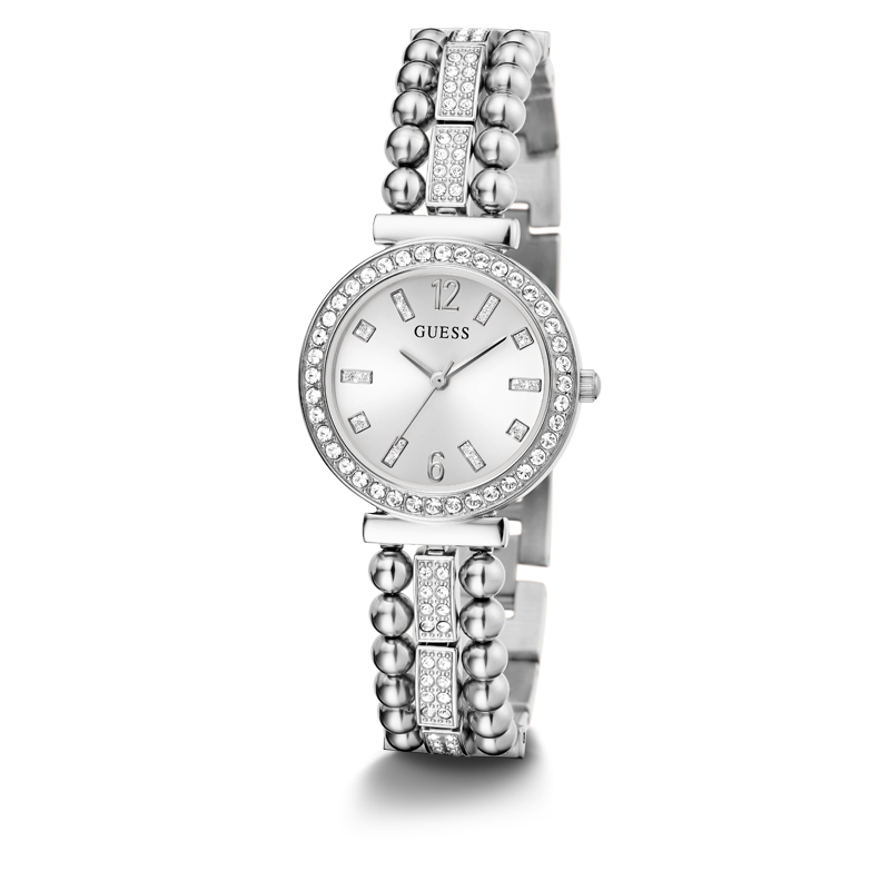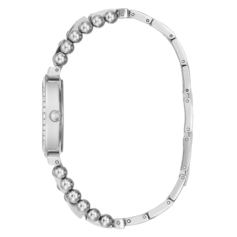 Ce design de montre est vraiment unique et magnifiquement conçu avec sa connexion uniques de boules et de cristaux. Il présente une lunette entièrement en cristaux et un cadran en argent ton sur ton, créant ainsi une montre à la fois élégante et élaborée.