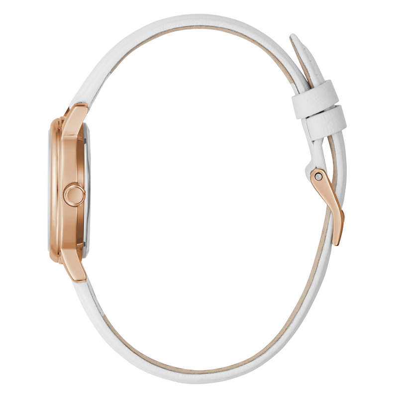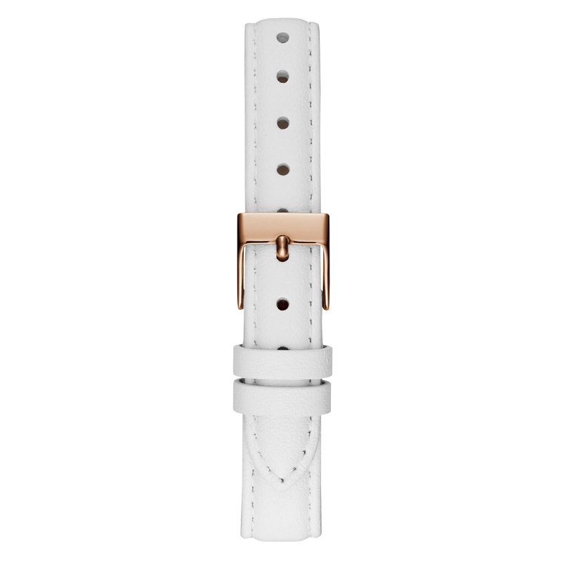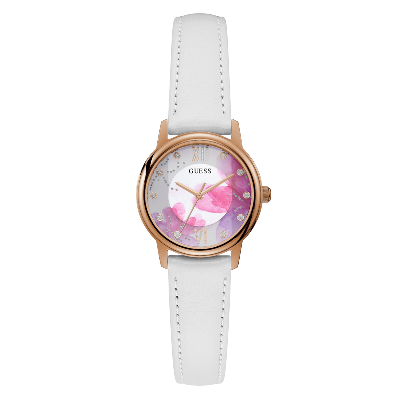 Montre pour femme dotée d'un bracelet blanc en cuir, et d'un cadran avec motifs floraux. L'ensemble est sublimé par un boitier rose gold. Cette pièce est une façon ludique et élégante d'ajouter de la couleur et de la gaieté à votre garde-robe