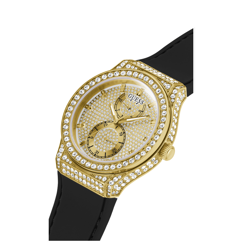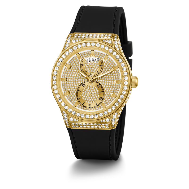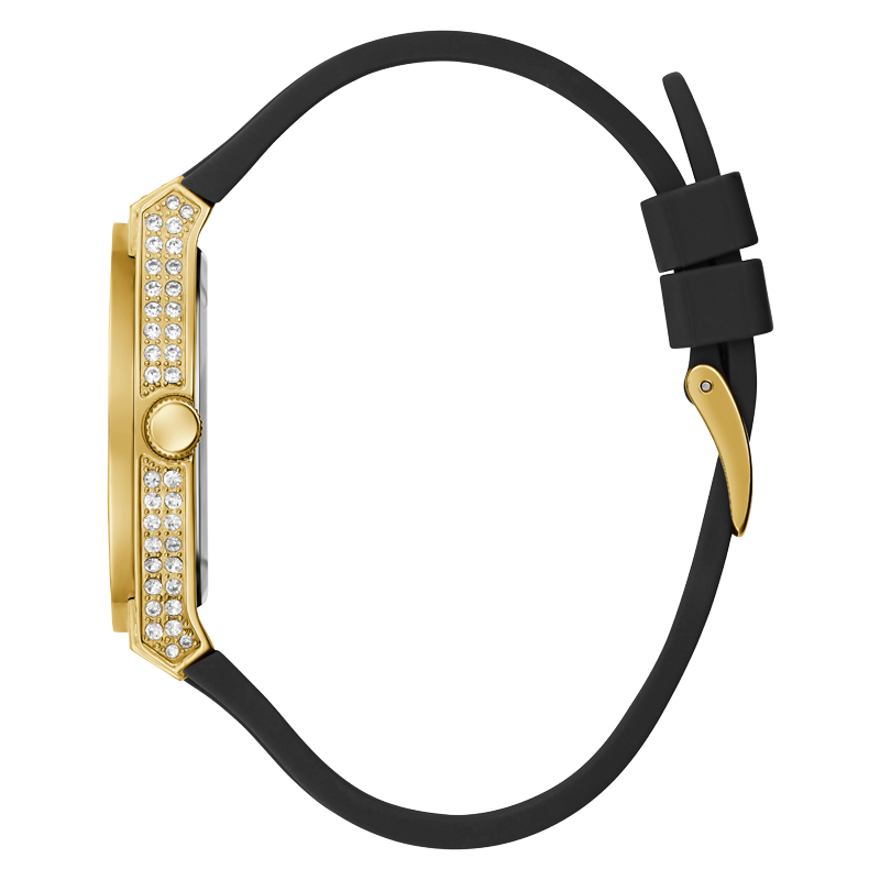 Cette montre étincelle de tous les côtés grâce à son design entièrement orné de cristaux, des deux côtés jusqu'au sommet ainsi qu'au niveau de sa connexion avec son bracelet en silicone élégant.