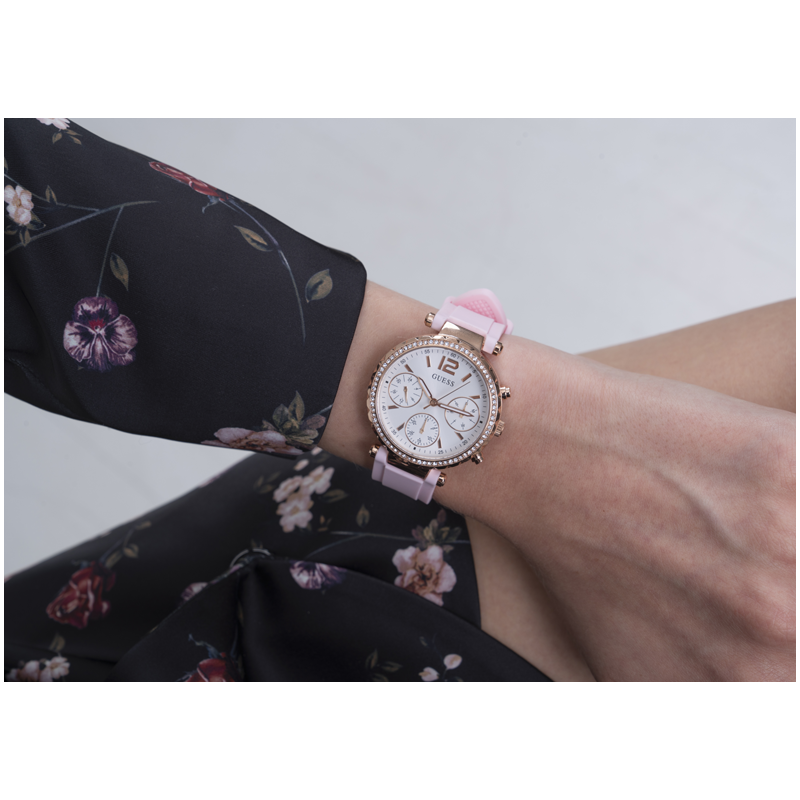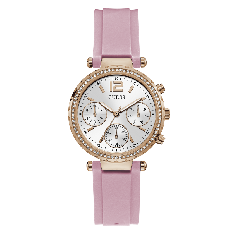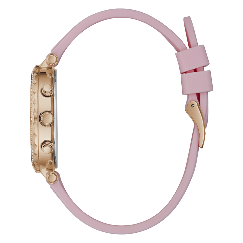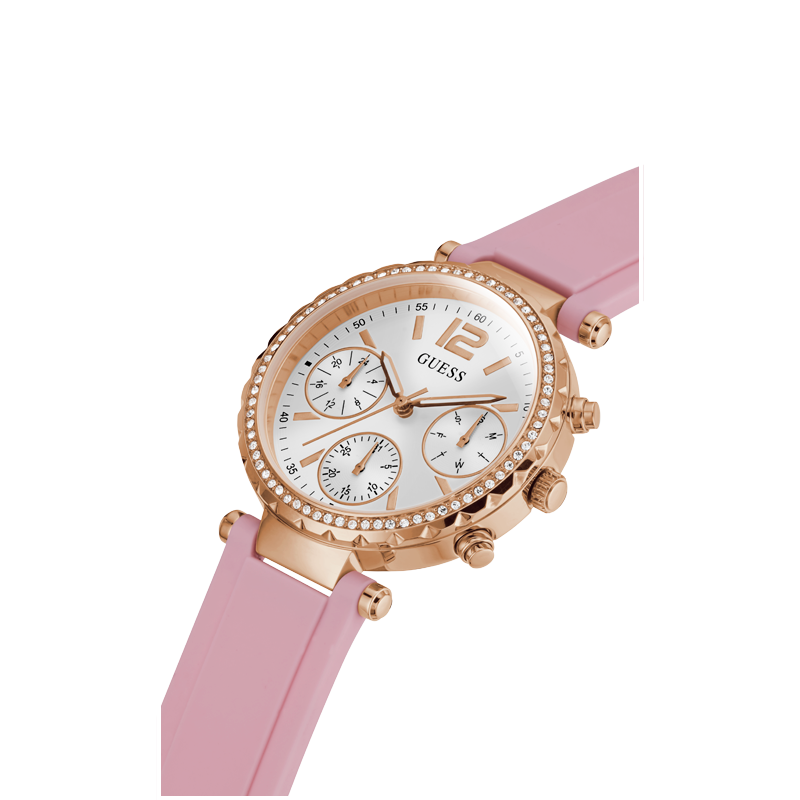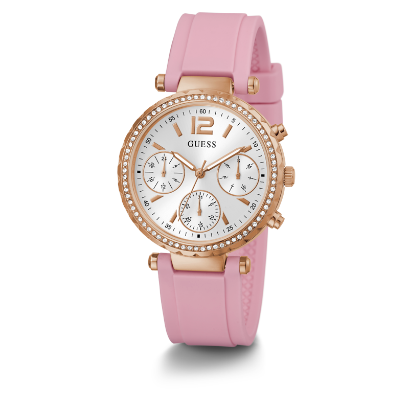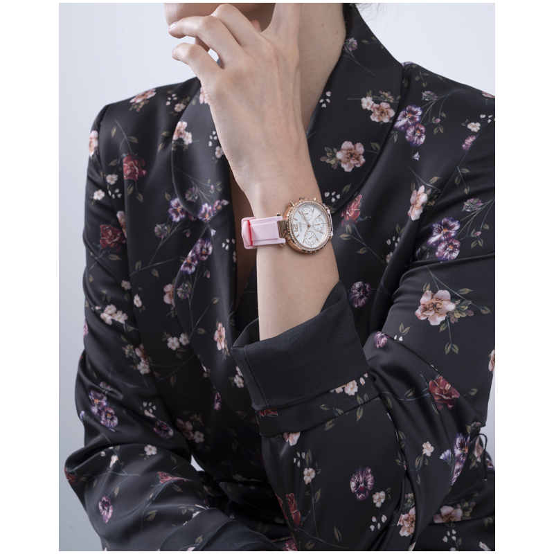 Douce et sophistiquée, cette silhouette présente un boîtier rose gold sur un bracelet en silicone rose, faisant de cette combinaison un accord parfait.