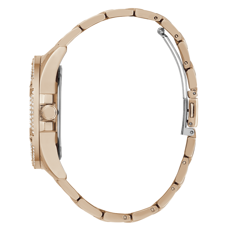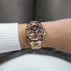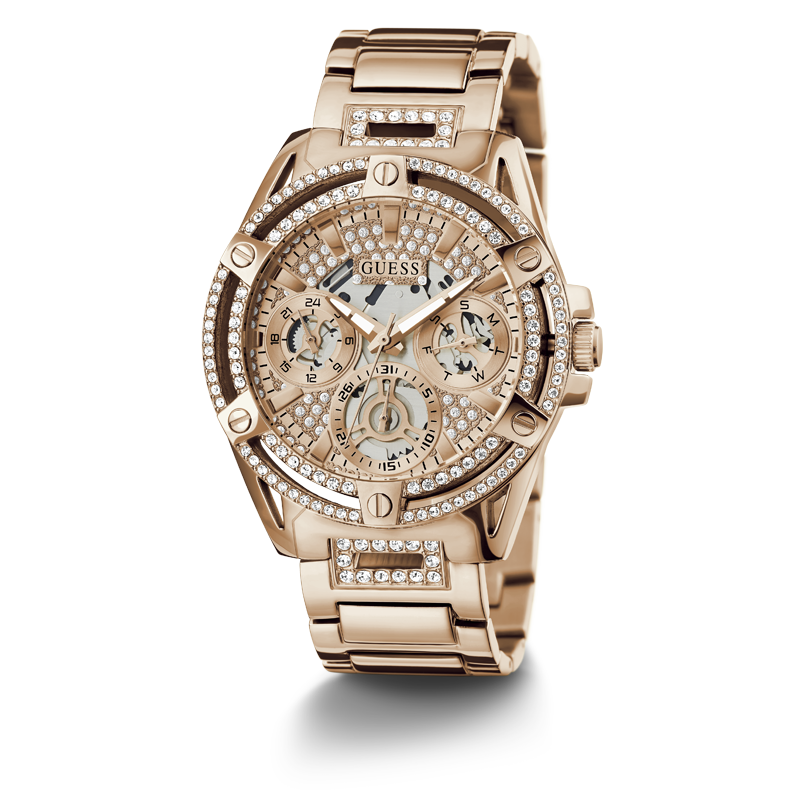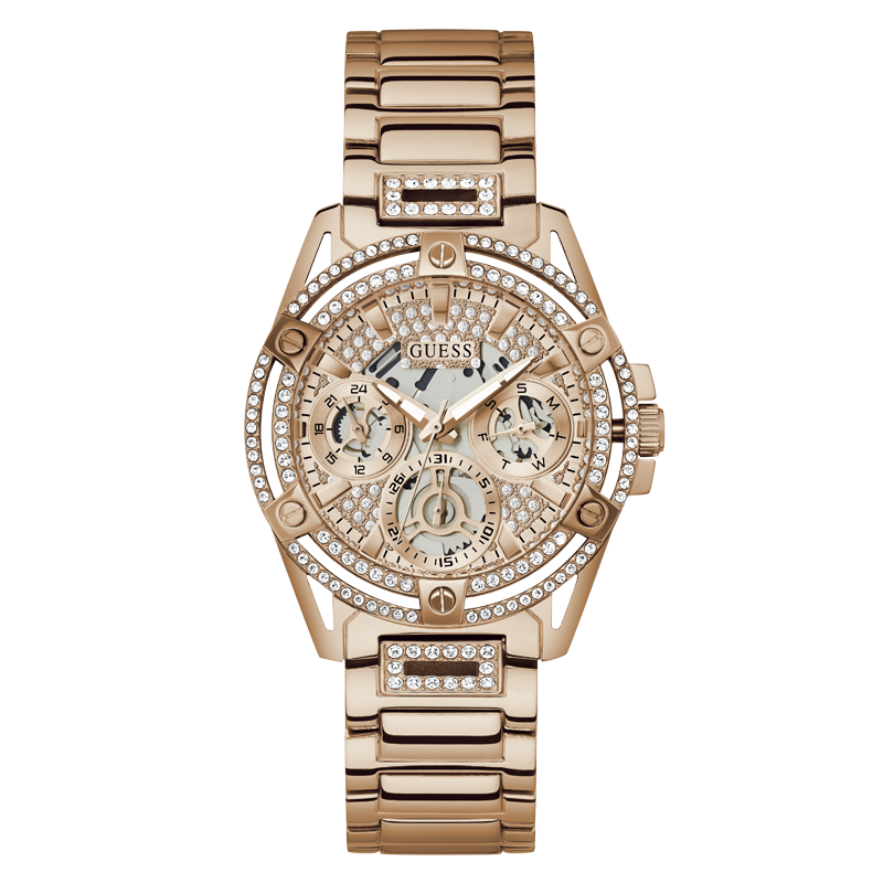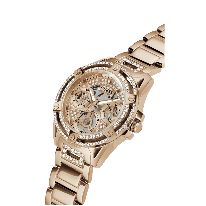 Un style classique avec un design innovant qui présente des détails découpés partout, du boîtier au bracelet, ainsi que sur le cadran qui permet de voir le mouvement de cette montre multifonction. Des éléments bling-bling sont ajoutés sur le boîtier et le bracelet, ainsi qu'une poudre scintillante sur le cadran pour un look luxueux et glamour.