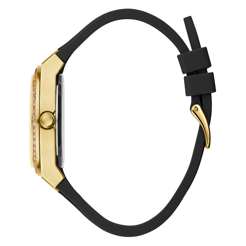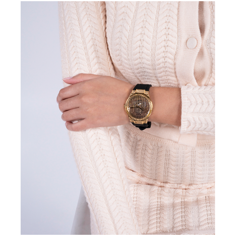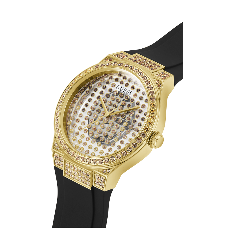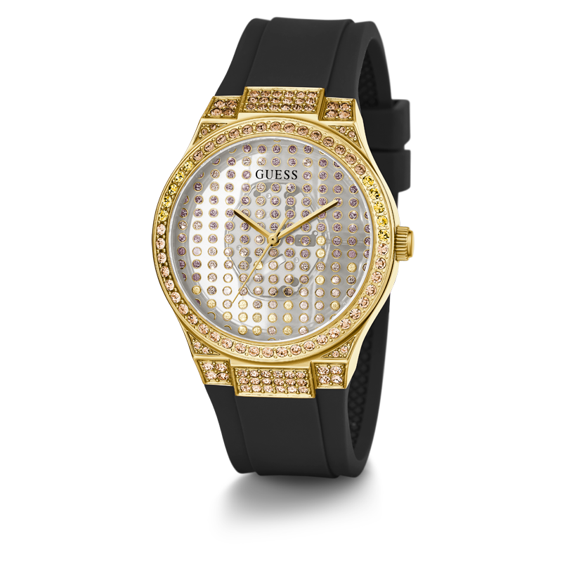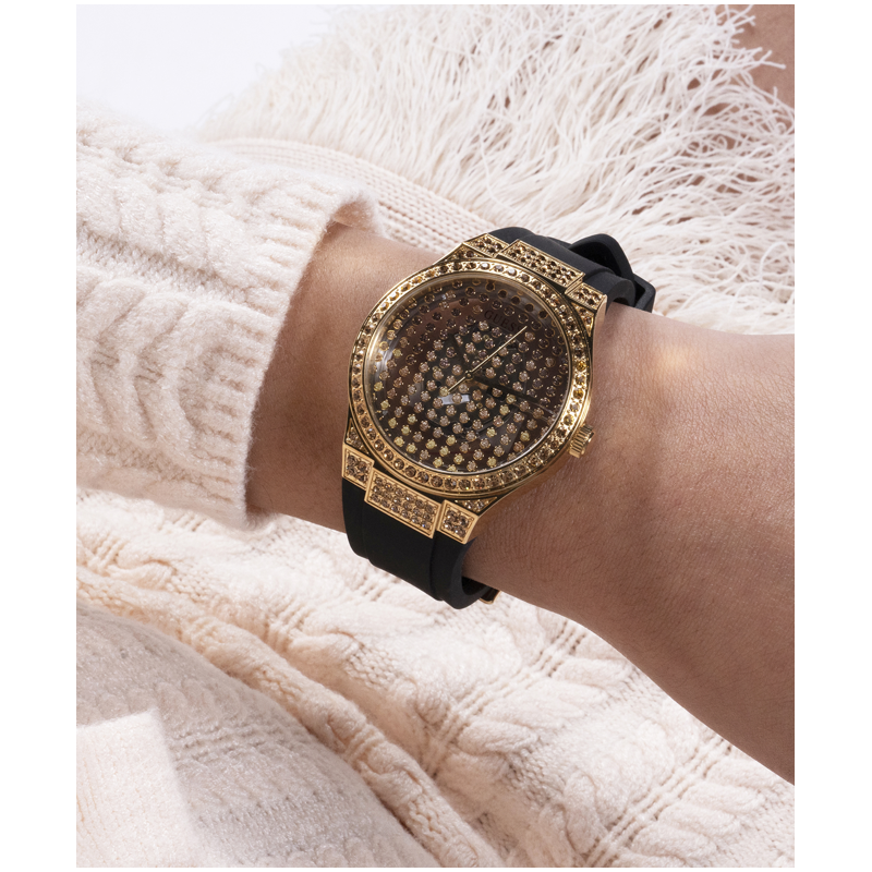 Cette conception éblouissante met en valeur des cristaux non seulement autour de tout le boîtier et des attaches, mais aussi des détails de brillance sur tout son cadran translucide. Associée à un bracelet en silicone élégant, elle est l'accessoire de mode ultime.