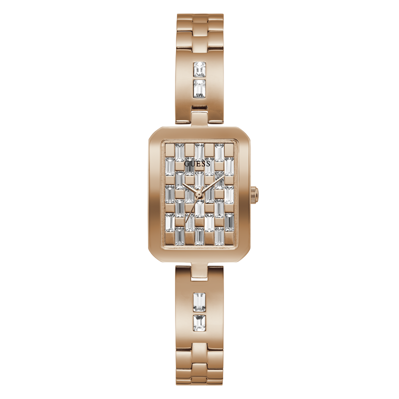 Ajoutez une touche de glamour avec cette magnifique montre rose gold ornée de cristaux en baguette sur le cadran et le bracelet.