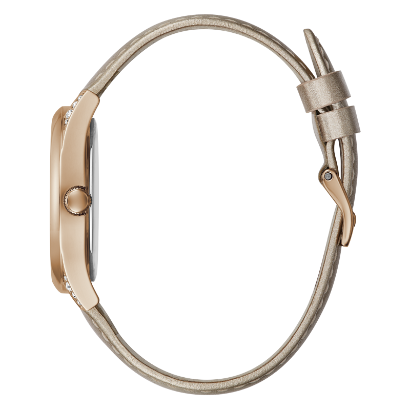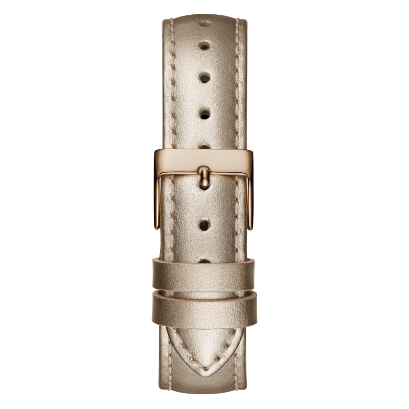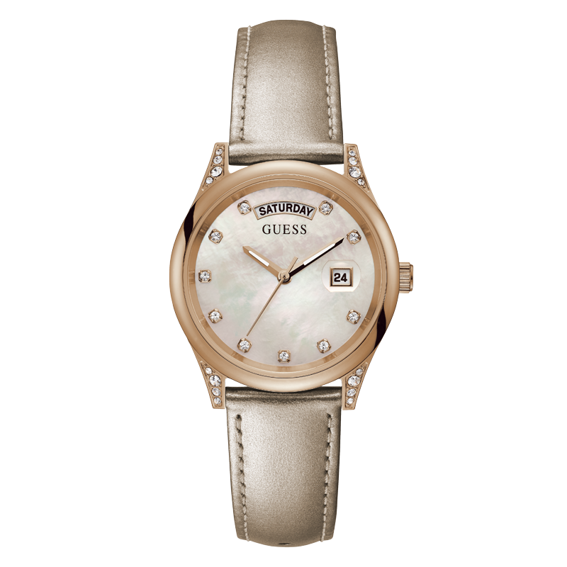 Apportez un look de luxe avec cette élégante montre qui présente un cadran en nacre sur une ceinture en cuir métallique nude.