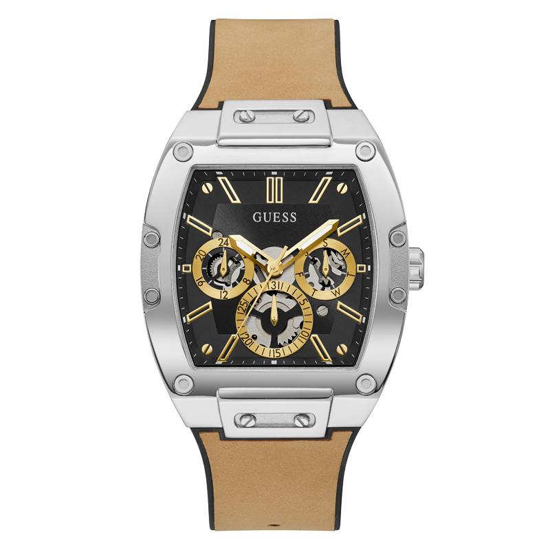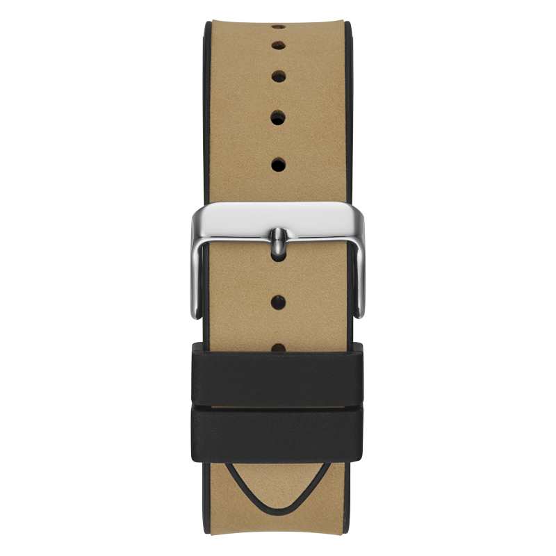 Ce modèle présente un boîtier en forme de baril couleur argent avec un cadran squelette multifonction noir. Il est également équipé d'un bracelet FLEX. Un bracelet souple en silicone noir associé à du cuir beige lisse et des surpiqûres beige assorties pour offrir un ajustement flexible pour chaque poignet.