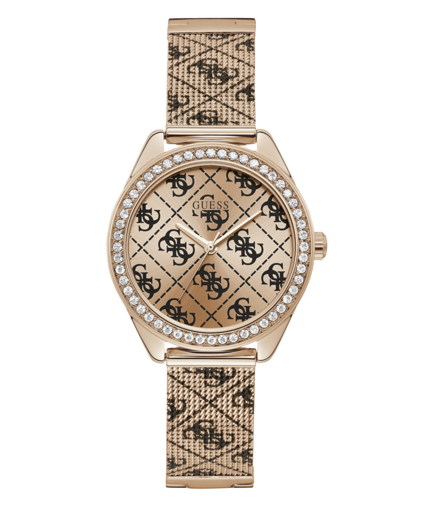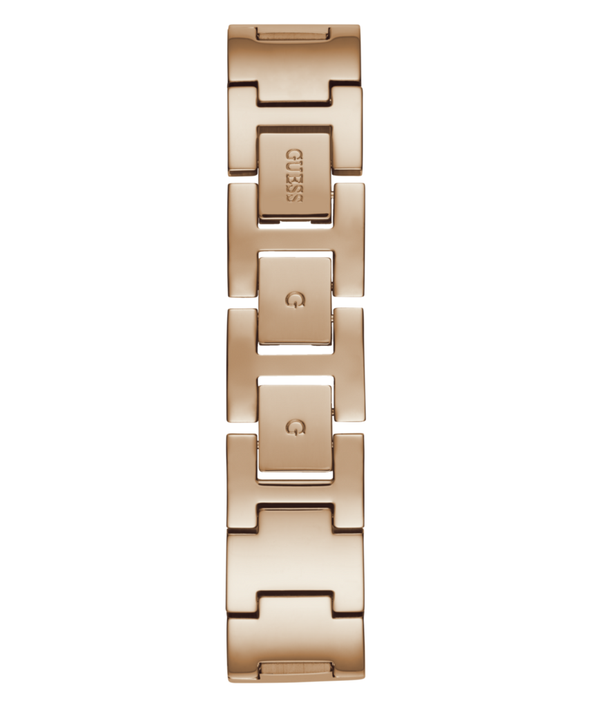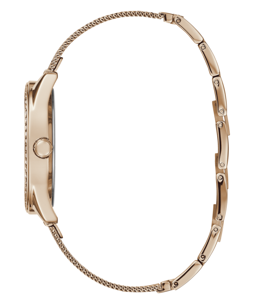 Montre Guess pour femme modèle W1279L3 de la collection Guess Claudia. Elle est dotée d'un mouvement à quartz avec affichage de l'heure sur trois aiguilles. Le boîtier est en acier inoxydable avec des cristaux sertis et un revêtement IP en or rose. La couronne et le fond du boîtier sont à pression