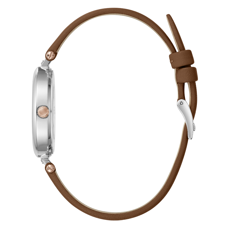 Ce modèle féminin présente un boîtier en acier inoxydable de 32 mm de diamètre, parfaitement adapté aux poignets féminins. Son cadran argenté ajoute une touche d'élégance intemporelle à son esthétique. Le bracelet en cuir véritable de couleur marron complète harmonieusement l'ensemble, ajoutant une note de style et de confort.