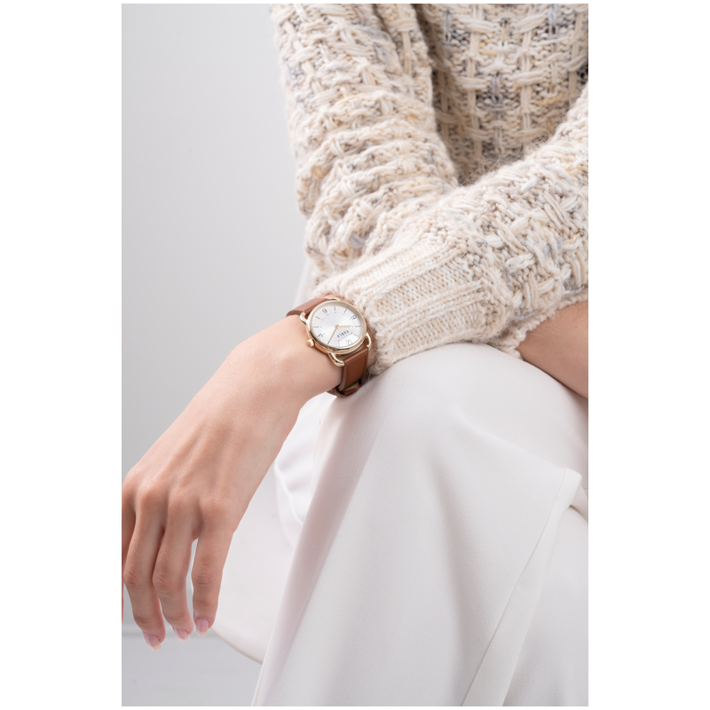 Son boîtier en acier inoxydable doré de 33 mm de diamètre émet une aura de sophistication et de luxe. Le cadran argenté est à la fois sobre et intemporel, tandis que le bracelet en cuir véritable de couleur marron ajoute une touche de chaleur et de confort à votre poignet.