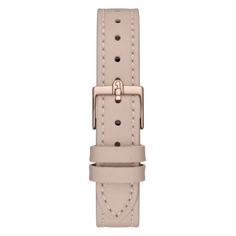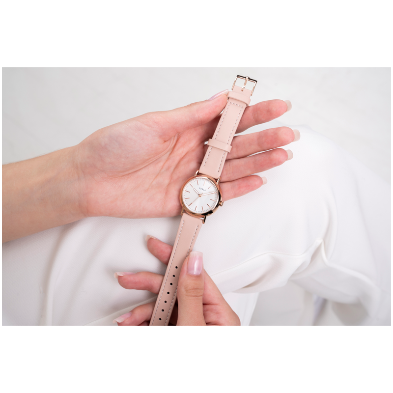Le cadran argenté crée un contraste saisissant, apportant une touche de modernité et de luminosité à cette pièce d'horlogerie. Le bracelet en cuir véritable dans une teinte Nude assortie offre un confort optimal tout en rehaussant l'esthétique.
