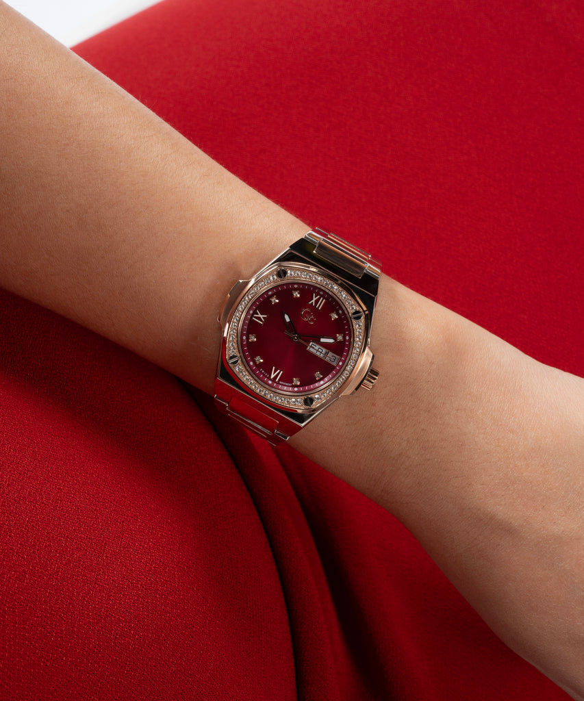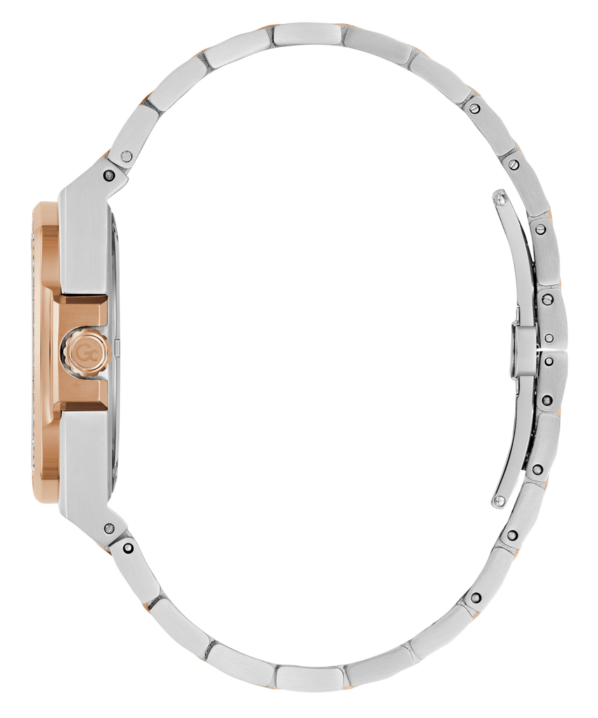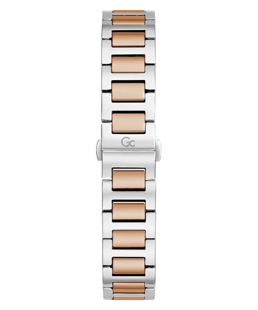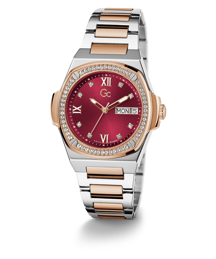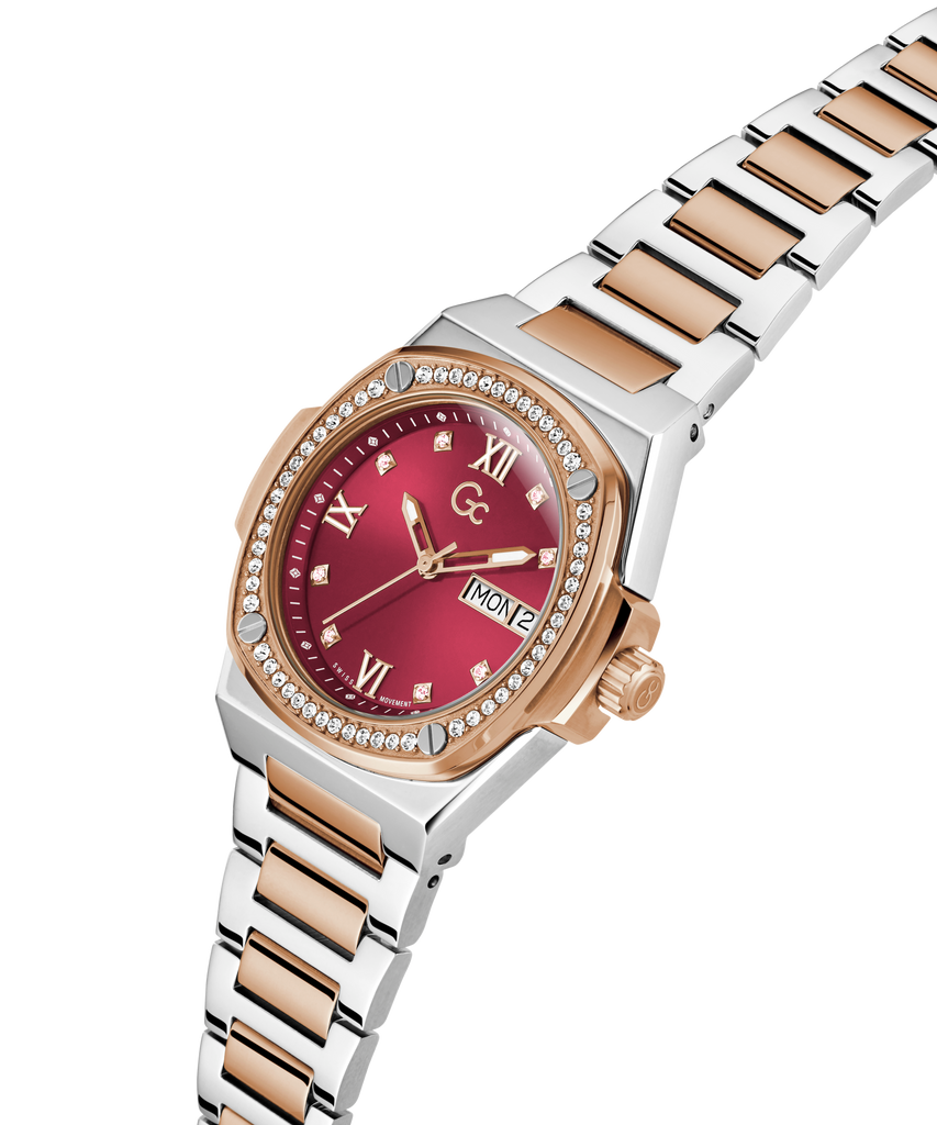 Revitalisez votre style avec la Gc Coussin Shape et son boîtier carré. L'élégance sophistiquée de l'or rose et l'éclat des cristaux confèrent à cette montre une allure à la fois élégante et audacieuse. Le boîtier charismatique abrite un mouvement suisse avec fonction jour-date, visible à travers une fenêtre à 3 heures. Il est entouré de cristaux et orné de détails à vis sur la lunette. Cette version bicolore argent et or rose présente un cadran rouge baie à effet soleil avec des aiguilles en or rose. Grâce à son bracelet à maillons multiples, cette montre offre un confort optimal au poignet.